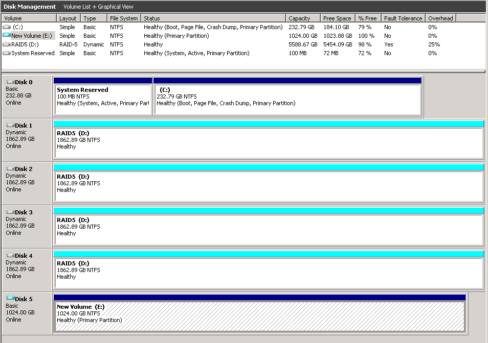 6TB Windows RAID 5 Array (4x2TB drives) – I had 5 of the same type of drive, so I have a spare. It’s been years since I’ve used software RAID, and I didn’t want to stay at RAID 0 or 1 as supported in hardware