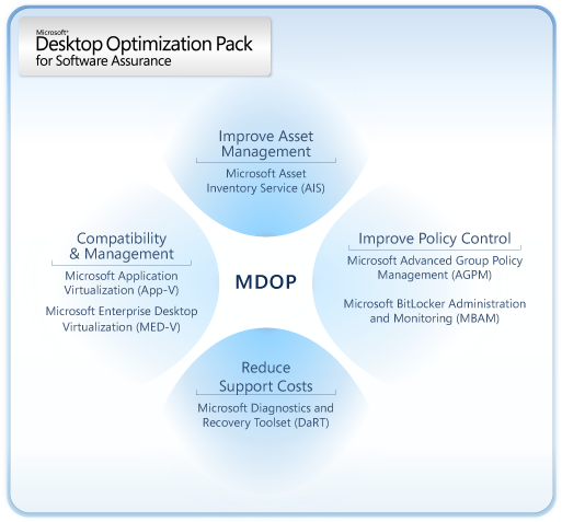 The Microsoft Desktop Optimization Pack (MDOP) is a suite of technologies available as a subscription for Software Assurance customers. MDOP helps to improve compatibility and management (App-V/MED-V), reduce support costs (DaRT), improve asset management (AIS) and improve policy control (MBAM/AGPM).