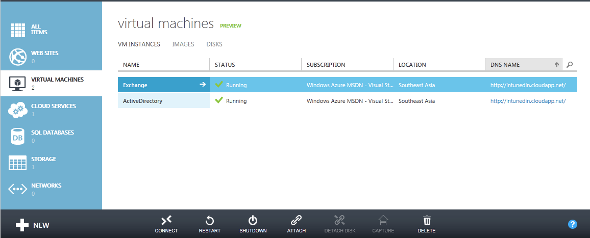Here are the two VMs I’ve created, one for Exchange/Active Directory, and the other for DirSync and the Exchange Connector for Windows Intune.