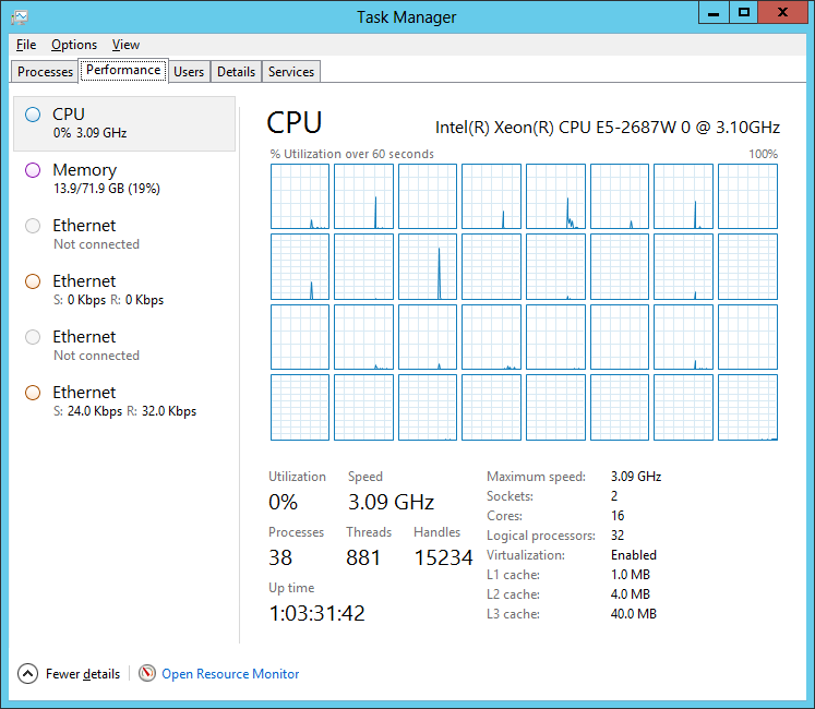 Due to close ties with Intel folk in a previous life, I’ve tended to be on the bleeding edge of core counts in my home machines. There was nothing more exciting than seeing the number of logical CPU’s exposed by task manager doubling every couple of years. Below is my current Hyper-V host, more than suitable for a while to come.
