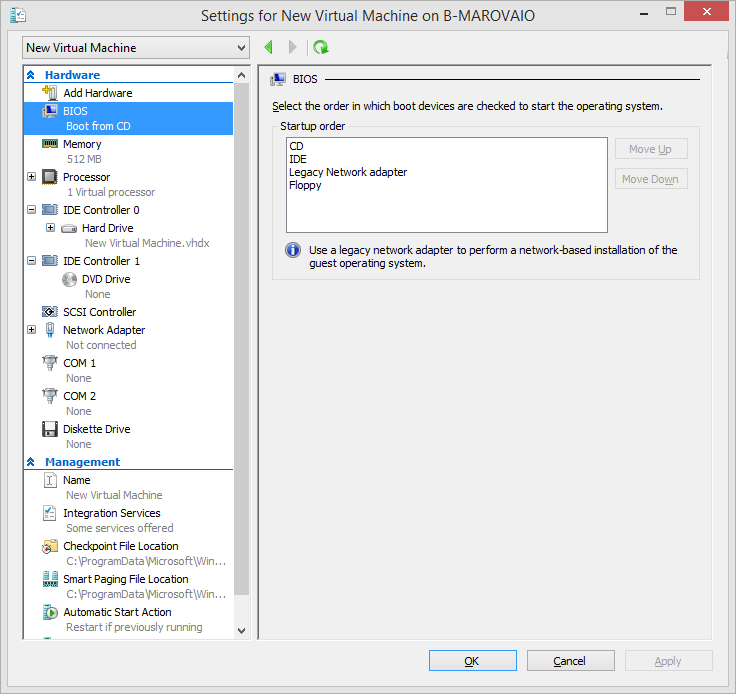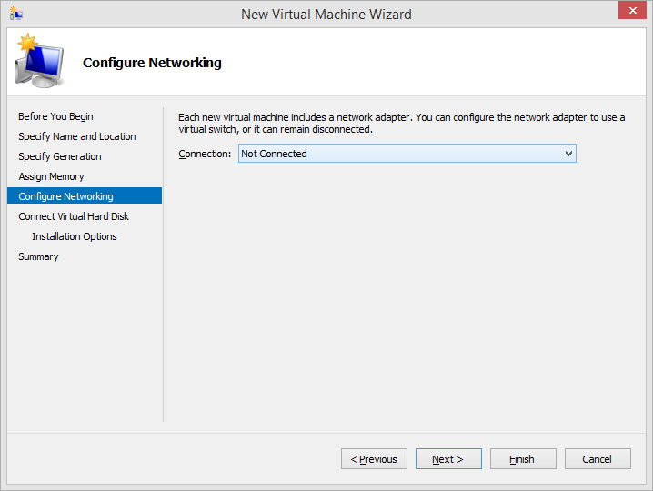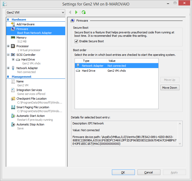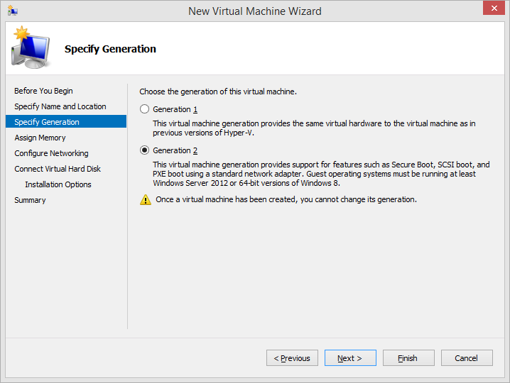 With the updated Hyper-V in Windows 8.1 Pro, one of the new capabilities is the Generation 2 virtual machines, which provide a number of benefits, but for me the big improvement is being able to do PXE installs into a VM at greater than 100Mb/s speeds, which is a common scenario for me and one that frustrates me for two two reasons. First of all, the deployment is slower, but the second one is the need to remember to remove the legacy adapter after the VM is created.