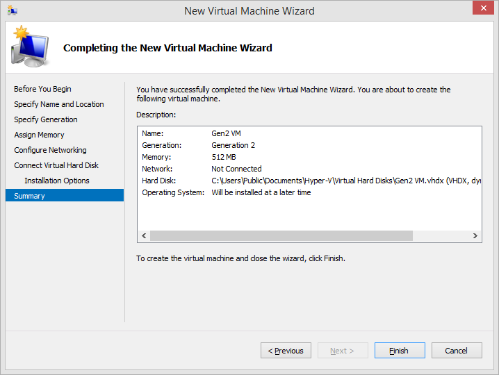 And the summary screen hasn’t changed much either, but it does give a final chance to notice that I did select a Gen2 VM.