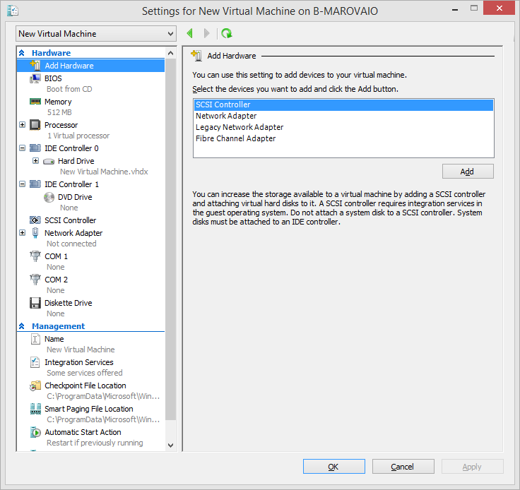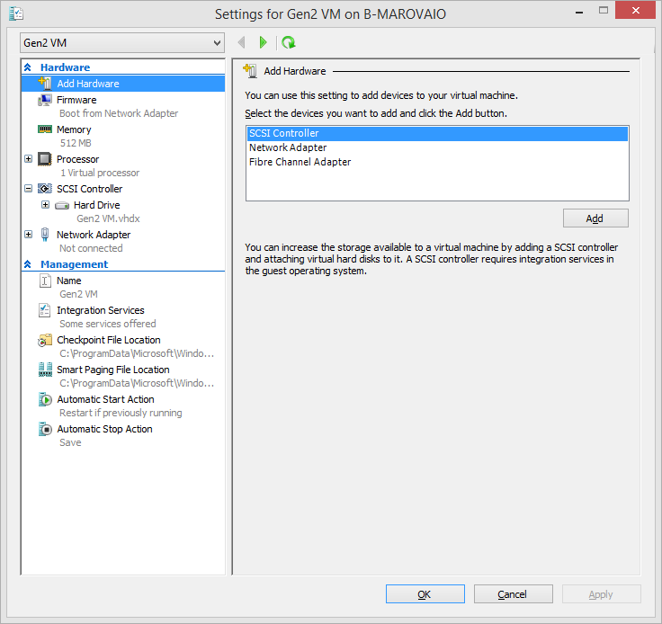 As we look at the storage options, we are only presented with SCSI based HDD or DVD in Gen2 VMs. One of the important changes here is that SCSI boot is now supported, so the legacy IDE adapter can be retired.