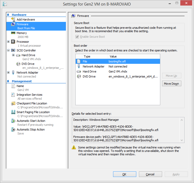 This is another screenshot of the Gen2 VM after Windows 8.1 Enterprise 64 bit has been installed as the guest OS, and you can now see that the Windows Boot Manager has kicked in.