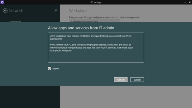 Now I can choose to Turn On device management, which in this case allows Windows Intune to manage by Windows 8.1 device as a mobile device.