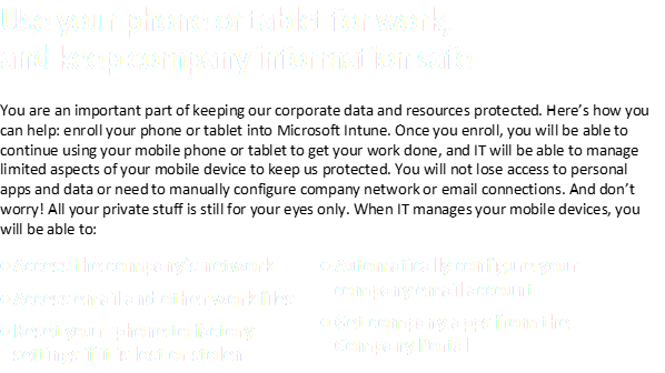 Last week the Enterprise Content Management Team published the Microsoft Intune Enrolment Guide in PDF and Word formats. The guide is customisable and provides high level instructions for users to be able to enrol their own Windows, iOS and Android devices .