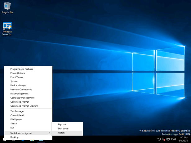 We need to manually restart the server, and for those used to 2012 R2/8.1 you can use the right mouse click on the Windows button to select this option, as well as the other supported methods for restarting.