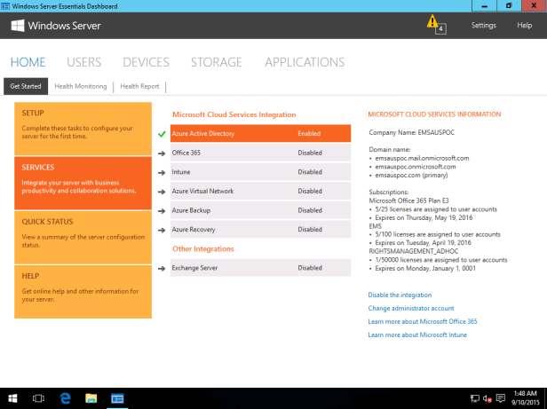 Going back to the Essentials Dashboard after the server restart we can see details such as the domain names in use in the Azure AD environment, as well as the available licenses. We can also disable the integration here if needed, as well as change the administrator account.