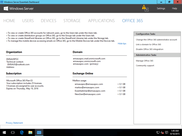 Clicking Close on the Integrate With Office 365 screen takes us to the Office 365 tab inside of the Essentials Dashboard, where we can see some information relating to the Office 365 subscription and the domain names in use, as well as seeing if anyone is at risk of hitting their 50GB mailbox allowance.