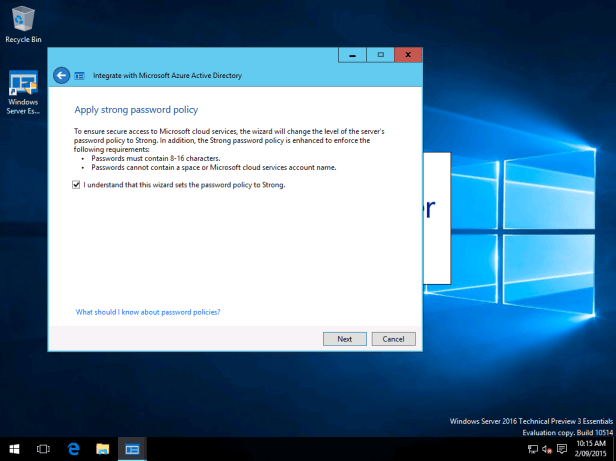 At this stage we need to acknowledge that the password policy in the local Active Directory is set to Strong, which helps ensure better password policies on the connected web services as well.