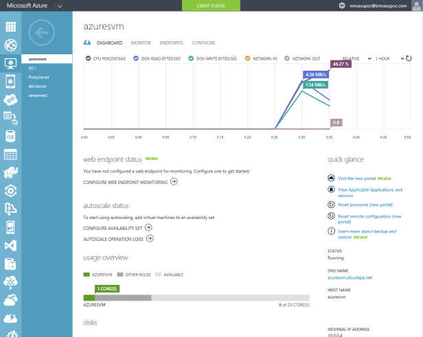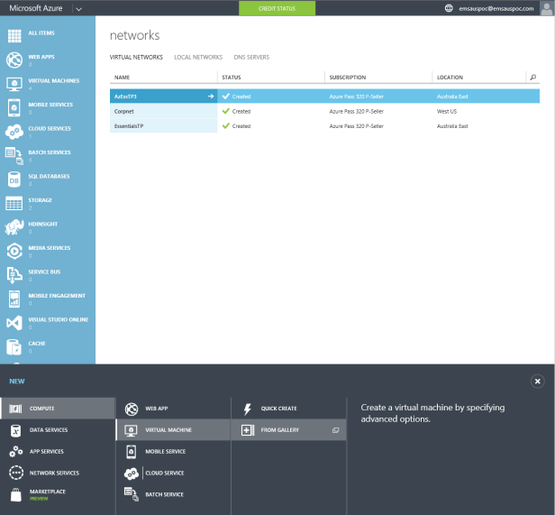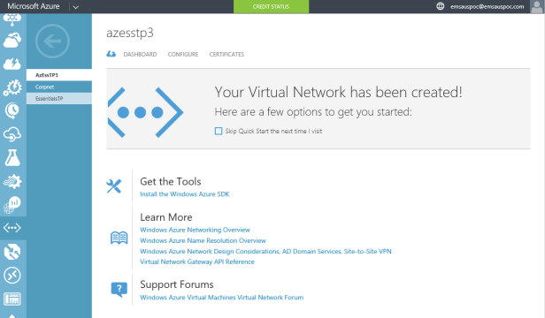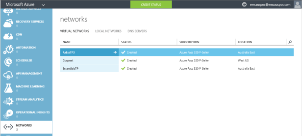 In the last post I covered what was required (very little, apart from an Azure subscription!) with Windows Server 2016 Essentials Technical Preview 3 to set up an Azure Virtual Network, but and today I’ll switch over to the Azure management portal so that we can see what was created for us. If you don’t have an Azure subscription to test with, just go to www.azure.com and sign up for a 30 day trial.