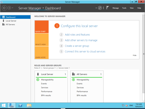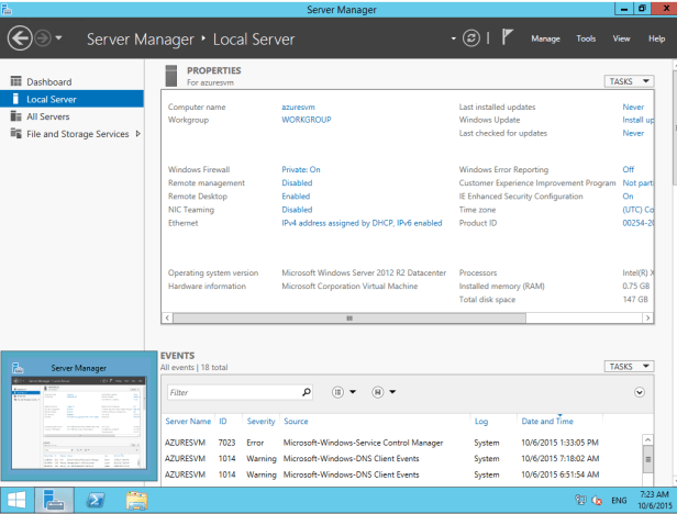 I can then launch the RDP connection from the Azure management portal, at which point I am taken into the freshly created VM, where Server Manager will auto launch by default.