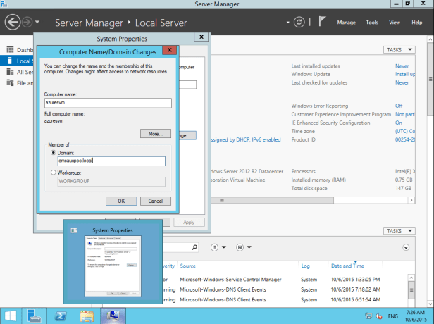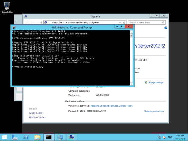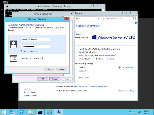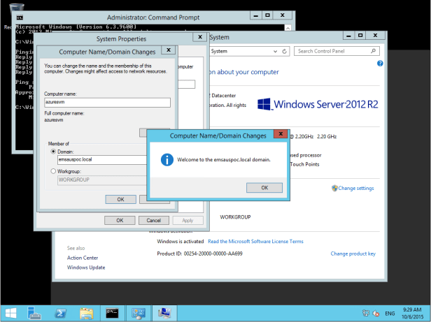 To test connectivity, I can just ping back to my on-premises server (I allowed this traffic through the firewall for the sake of this test). I can successfully ping my local network resources, so it’s time to complete the domain join process.