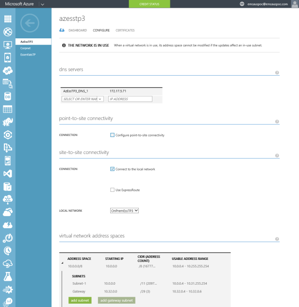 Under Configure you can see the on-premises DNS server details, and that the connection has been set up as a Site to Site connection rather than as a point to site connection, which would be used more often in a client to virtual network type scenario.