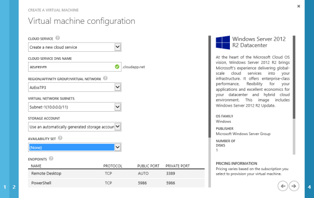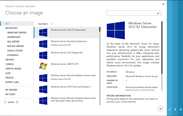 If you haven’t seen the Azure Virtual Machine creation process, I’ll walk you through some of the steps here. First of all you can see that there are range of Microsoft, Linux and Oracle offerings that we can leverage, it’s not just Windows!