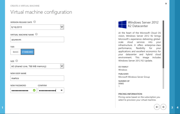 After that last comment, of course I do choose to create a Windows Server 2012 R2 Datacenter image, I’m deliberately choosing a lower size VM to keep costs down, and I need to provide a username and password that meets the Azure requirements.