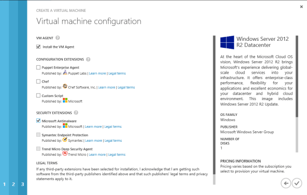 Just a few more selections to install the VM agent and the Microsoft Antimalware security extension, and then I click the tick and the VM provisioning process begins.