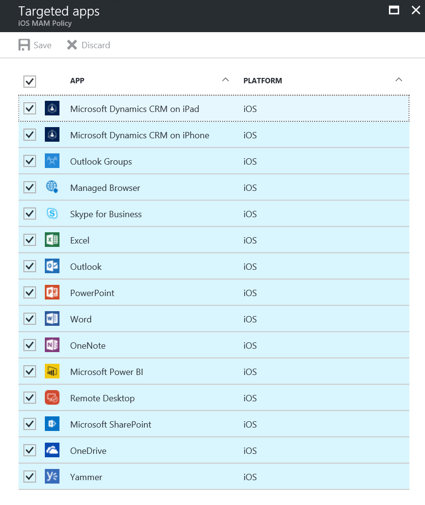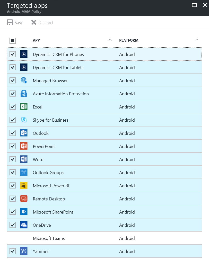 What’s worth calling out right now is that the Azure Information Protection app and OneNote app are only available on one of the platforms as far as MAM only/Intune App Protection are concerned.