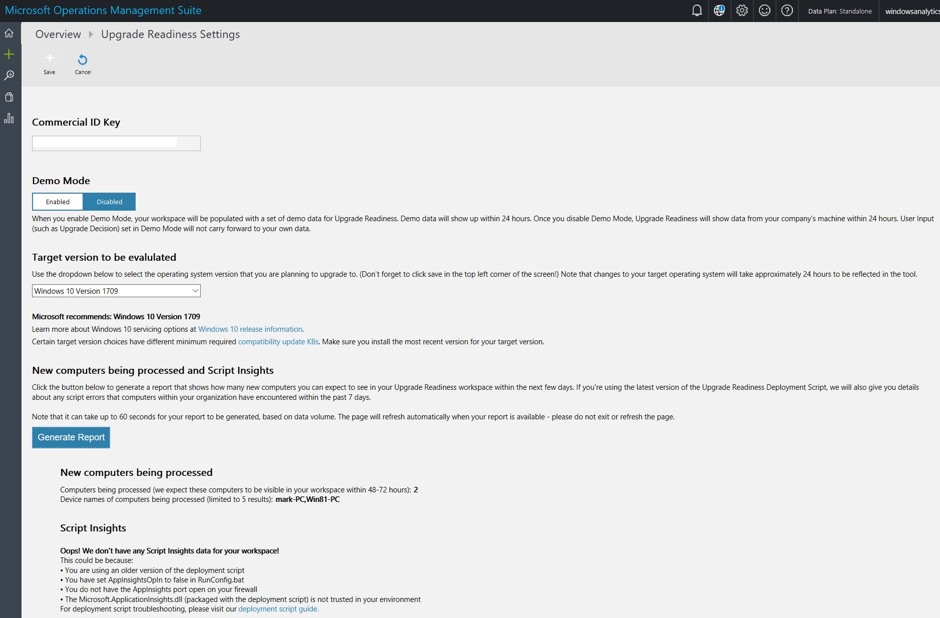 I had to click the Generate Report button, which advises that the computers should be visible in the workspace within 48-72 hours, which makes this a good place to end this post.