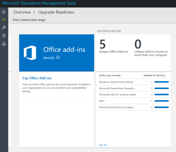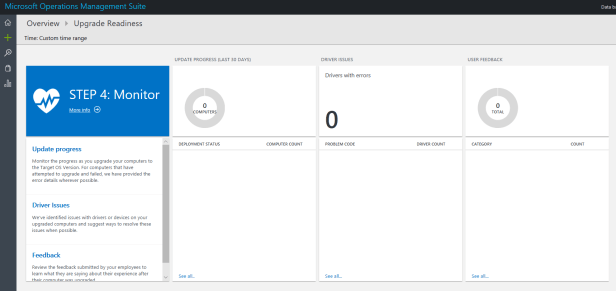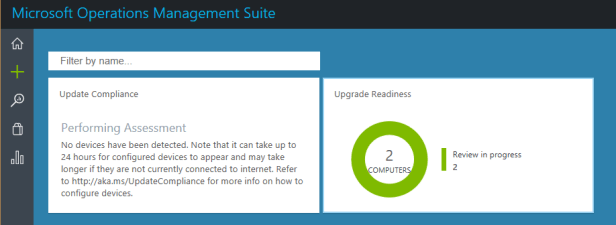 Starting in the OMS Workspace you can see that Upgrade Readiness is reporting that our Windows 7 Pro and Windows 8.1 Pro PCs have been processed. Click on Upgrade Readiness to drill in to the solution.
