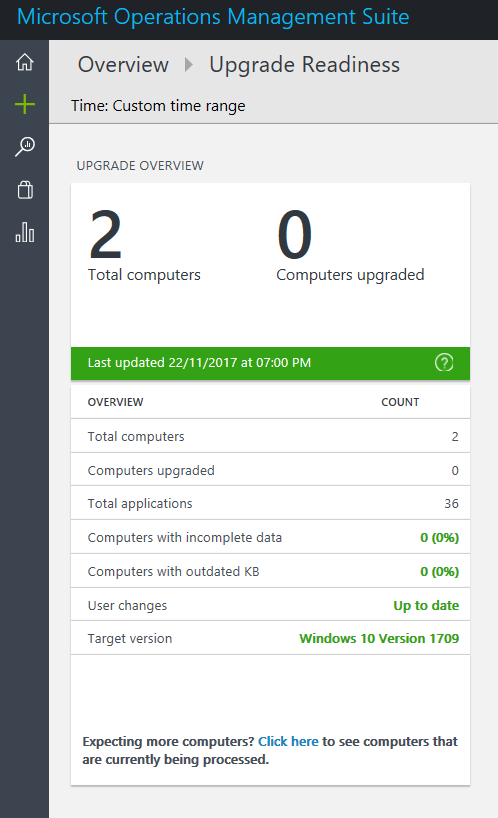 us what we would expect, some very high level details of computers and application counts. You can also see that Windows 10 Version 1709 has been chosen as the target, and tomorrow I will dig further into this and give some explanations as to why you may choose this option versus the other options.