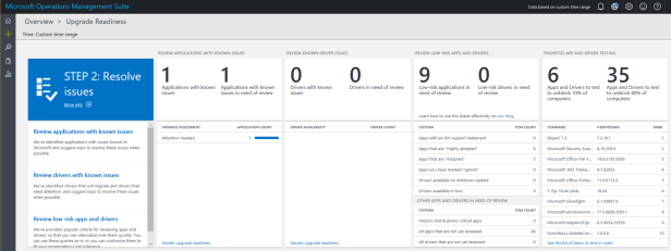 Step 2: Resolve Issues is showing that there is 1potentially problematic app, but no driver issues. Because these PCs are Hyper-V VMs, seeing no issues with drivers should be expected.
