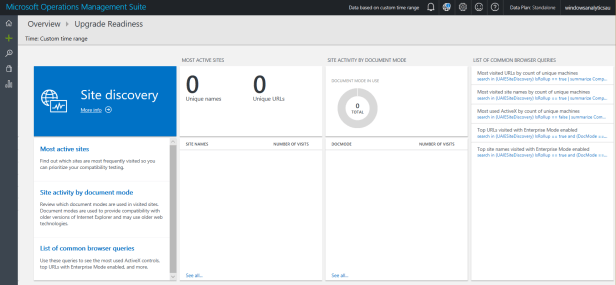 And finally, if you opted in to IE reporting, you will see information populated in Site discovery. If you have older line of business apps that have stronger IE dependencies this is going to be useful information, but if you are already accessing your web applications from a variety of platforms and devices this should be much less of an issue. The worst case scenario is that you might identify a few sites and ActiveX controls that weren’t considered for the migration.