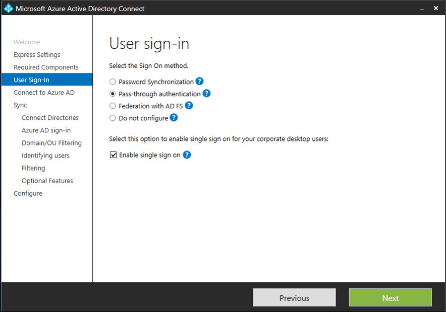 For most SMB environments, two of the common settings to enable are Password Hash Sync (PHS) and Seamless Single Sign-On. PHS allows the synchronisaton of a hash of the hash of the Active Directory password, allowing uses to be able to access Microsoft 365 services with the same password they use to access traditional on-premises resources. While there are more advanced options such as Pass Through Authentication (PTA) and Active Directory Federation Services (AD FS), I would only start looking at this options if they address a requirement that AAD Connect can’t. If you need more information on how PHS works, check out Implement password hash synchronization with Azure AD Connect sync.