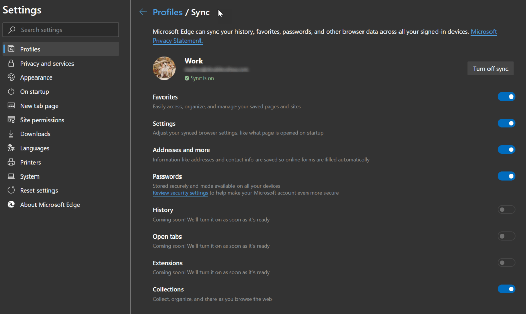 However, once you jump in to Settings, Profiles, Sync, you can see that there is more to come, including History, Open tabs and Extensions.