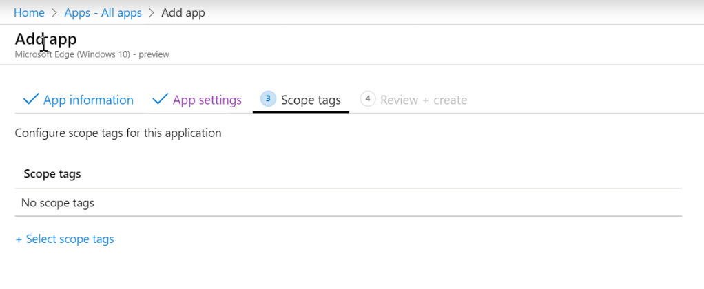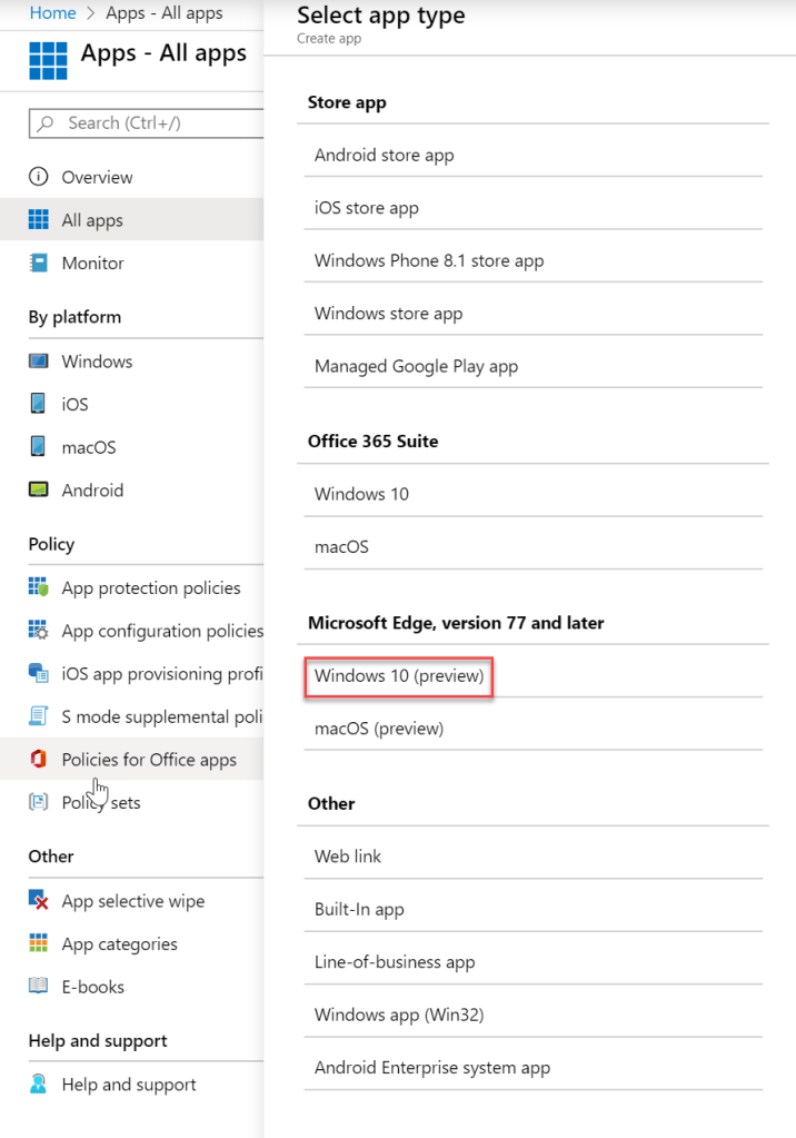 Now let’s focus on getting Edge deployed via Intune. Start by going to Apps, All apps, Add. This will bring up the Select app type, where you will see Microsoft Edge listed. Depending on when you read this you may still see the (preview) text like the screenshot below, but no doubt that will disappear pretty soon. Don’t interpret this to mean that this is only for preview channels, the stable channel option is available as you’ll see shortly.