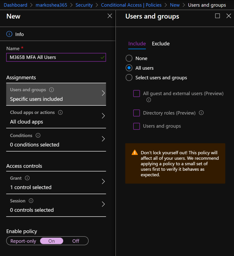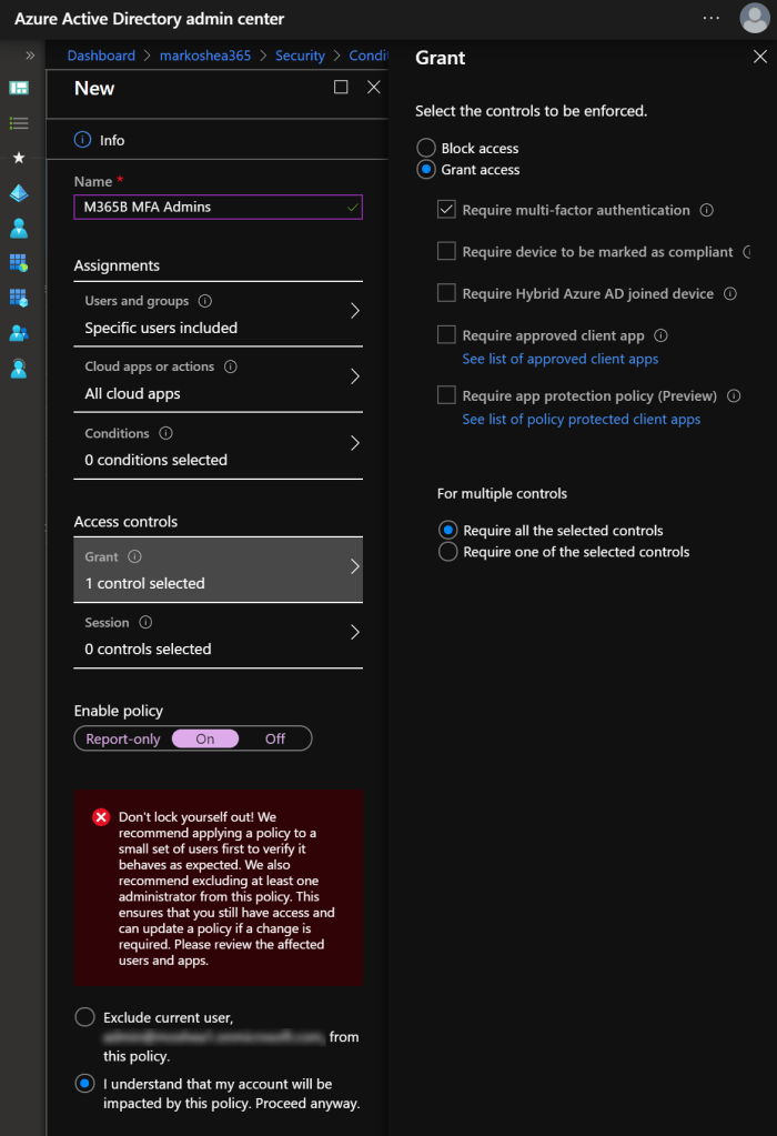 Last but not least, we need to Grant access if MFA requirement is met, and enable the policy. You will be prompted to exclude the current user, but if you have already verified that MFA is working for that account it’s safe to ignore it and apply to all roles.