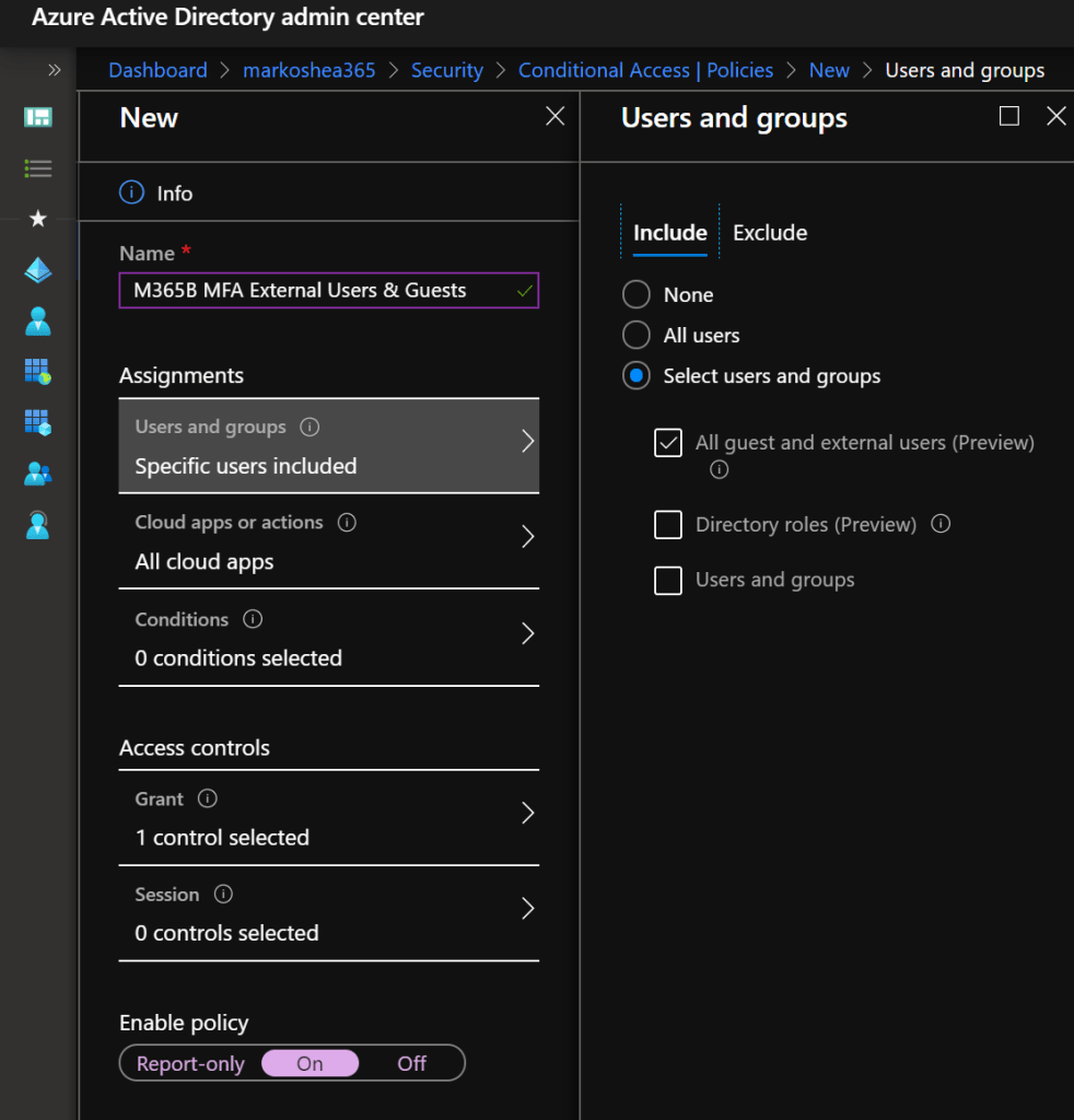 You might also want to also create a policy for All guest and external users (Preview) even if the environment isn’t quite ready to invite external users into Teams or other collaborative tools. If we are setting up the other policies, we might as well add this one as well, even if it’s planning for the future.