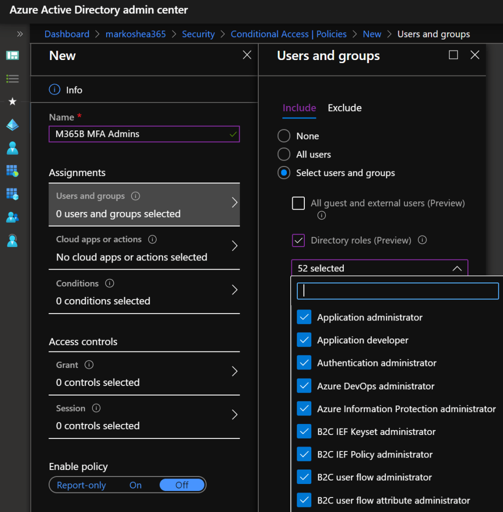 Jumping in to the Administrators MFA policy, we start by selecting Directory roles (Preview) and then selecting the roles. There isn’t a select all option, so just click through all of the roles on the list. This also means that we will need to periodically check on this list to make sure newly added roles are also being protected. Don’t worry too much about any exclusions yet, just make sure you already have at least a Global Admin successfully able to use MFA.