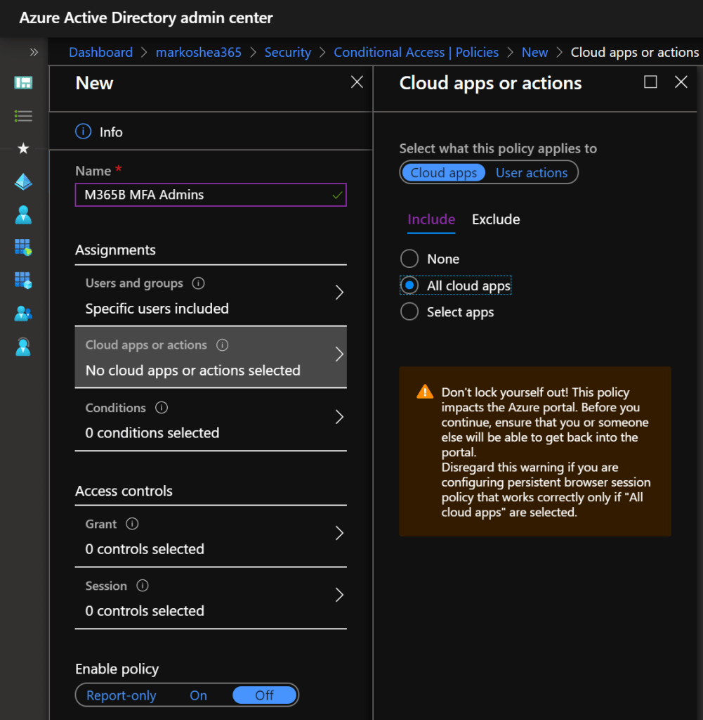 Moving on to the main topic, enforcing MFA for Admins and Users. We could create a policy that does both in one, such as just creating it for all users and all apps, but creating two policies gives us a bit more flexibility, and makes it easier to allow staged rollouts to admins, and then selected groups of users before going all in.