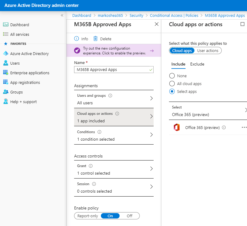 This post is going to wrap up by focusing on controlling which apps can be used for access, so I won’t start with creating policies from scratch, instead we can focus on the app specific elements. What we are going to do in this scenario is ensure that iOS and Android users are using approved apps to access Office 365 related applications. We start by selecting the Office 365 (preview) option under Cloud apps or actions.